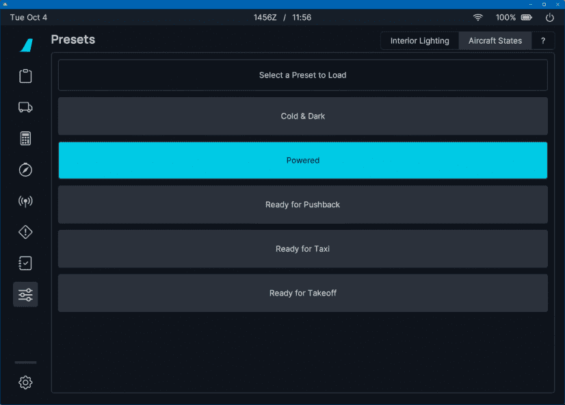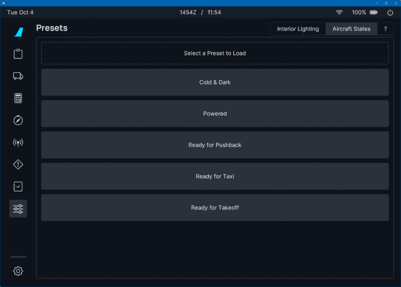To load a preset, please click on the "Load Preset" button. The aircraft must be powered for the buttons to be enabled.