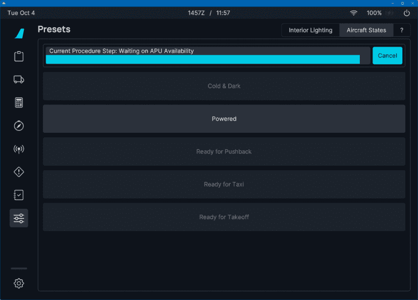 E.g., if the virtual co-pilot started the APU and you turn it off before the procedure is complete it can happen that the virtual co-pilot waits in vain for this step to complete. In this case, you must cancel the loading with the Cancel button.