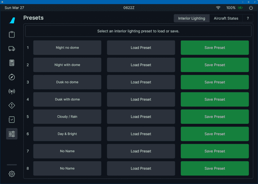 Lighting Preset can only be loaded and saved when the aircraft is powered.