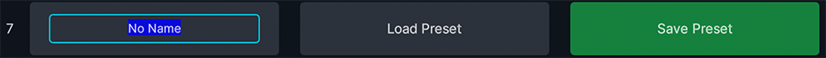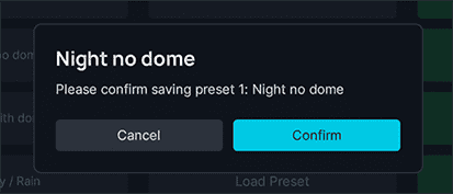 To change a preset's name, click on the current name of the preset and change the name to any string up to 16 characters. When you leave the input field, a confirmation dialog will ask you to confirm the name change. Press Confirm to save the new name.