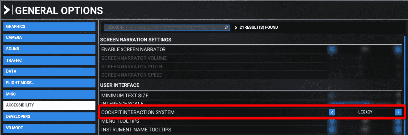 We recommend the legacy (previous) method of the Cockpit Interaction System (Menu > General Options > Accessibility).